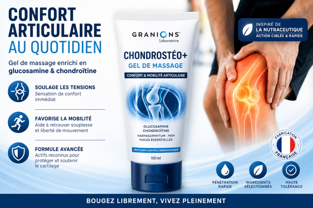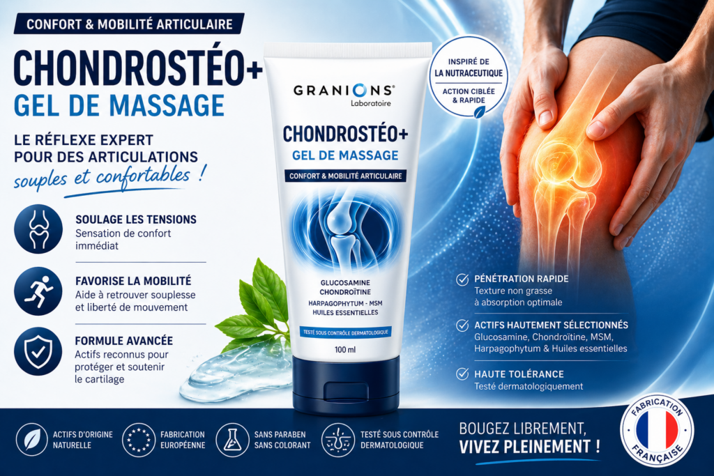 Dans un contexte où les troubles articulaires touchent une part croissante de la population — sportifs, seniors ou actifs sédentaires — Chondrostéo+ Gel de Massage GRANIONS s’impose comme une solution dermo-cosmétique avancée inspirée des compléments alimentaires.